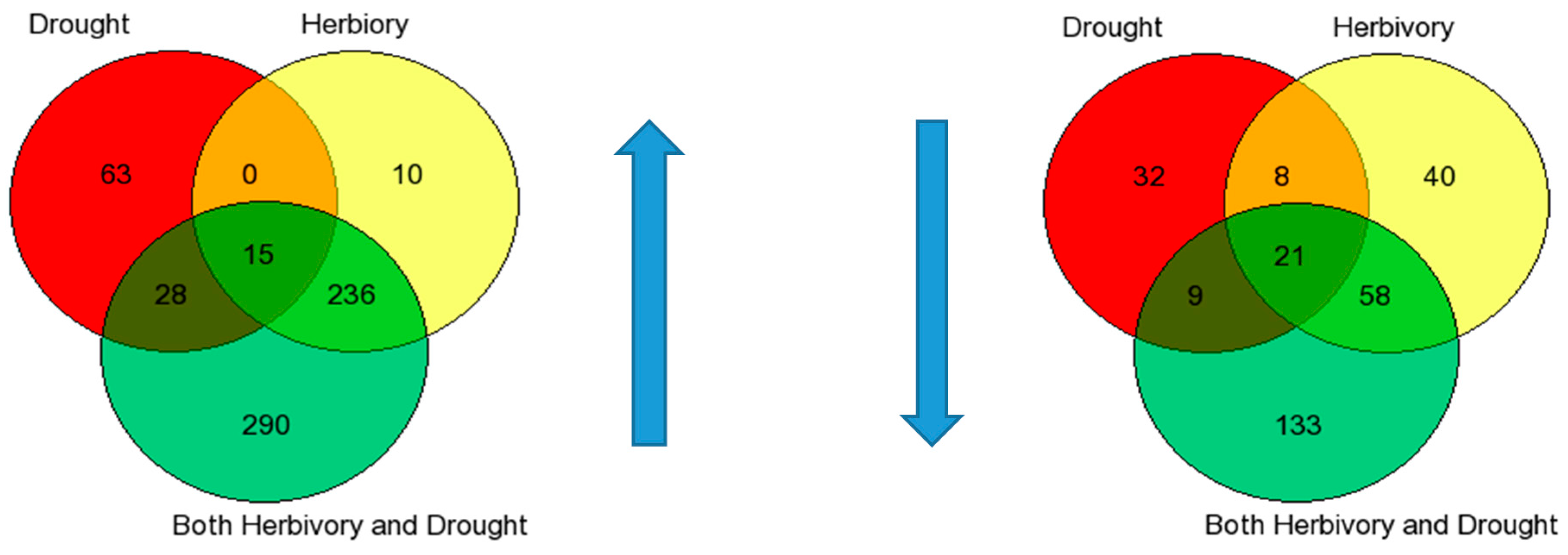 Venn diagrams for number of significantly up- and down-regulated genes (direction of blue arrows indicate up- or down-regulation). Red circle is Drought vs. control (no stress), Yellow circle = Herbivory vs. control (no stress), Green circle is double challenge Drought + Herbivory vs. control (no stress). Number of biological replicates, n, in comparisons: red circle, drought vs. control (n = 8); yellow circle, herbivory vs. control (n = 6), green circle, double challenge drought + herbivory vs. control (n = 8).