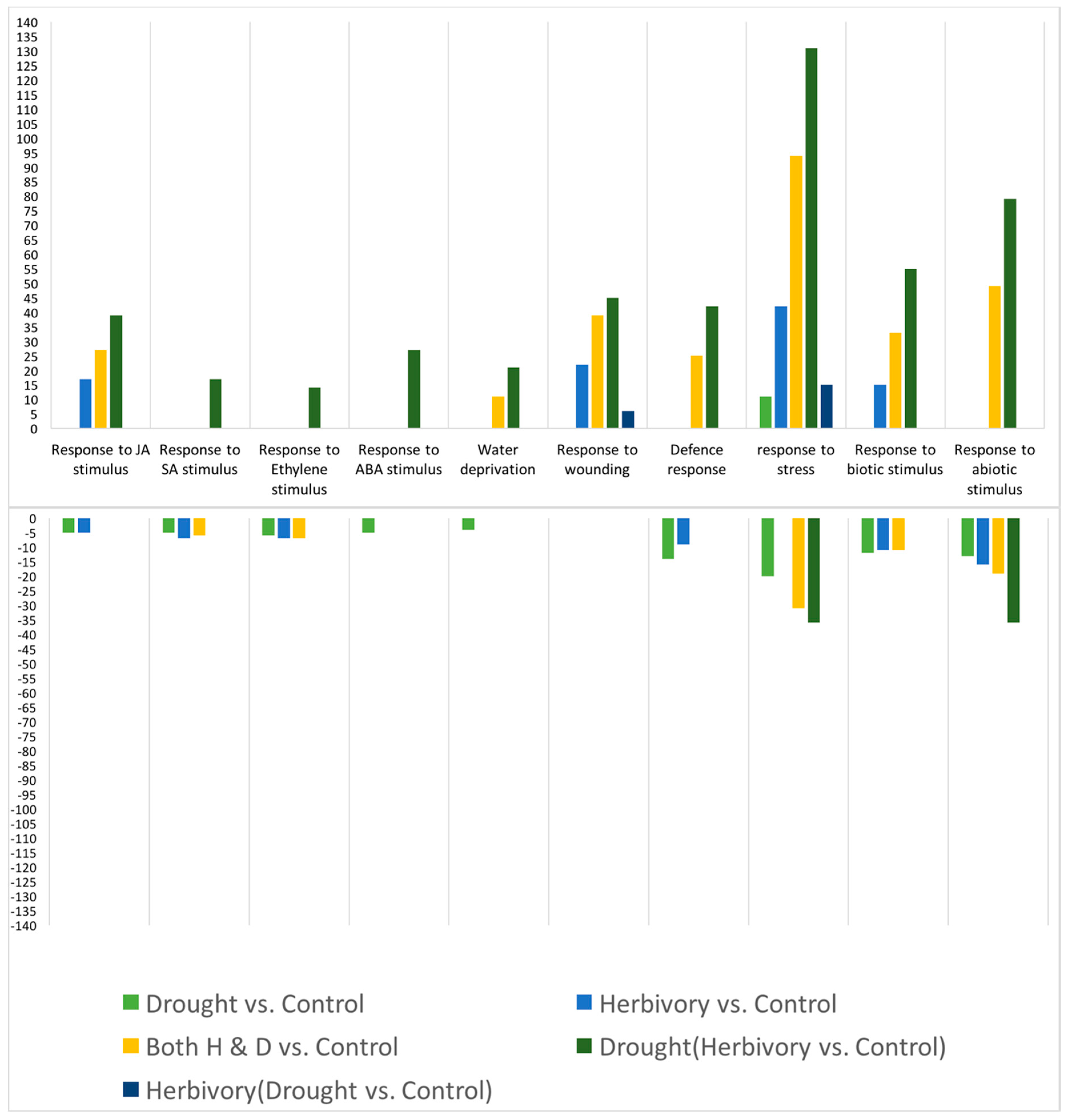 Number of significantly up- and down-regulated genes by defense and drought-tolerance functional categories. Herbivory (Drought vs. Control) means that both drought and control-watered treatments were fed upon by herbivores. Similarly, Drought (Herbivory vs. Control) means that plants in the presence and absence of herbivores were under drought stress. Number of biological replicates for the comparisons ranged between 6 and 10.