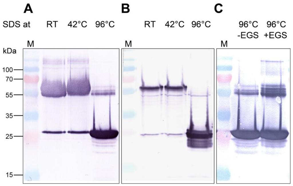 Recombinant Arabidopsis allene oxide cyclase 2 (AOC2) is a trimer. His-tagged proteins were purified on Ni-NTA, treated with SDS at given temperatures for 5 min and separated by SDS-PAGE. Detection of proteins was performed by immunolabeling using an anti-His-tag antibody. (A) Recombinant AOC2 protein with N-terminal His-tag; (B) recombinant AOC2 protein with C-terminal His-tag; (C) recombinant AOC2 protein with N-terminal His-tag cross-linked or not with 200 μM glycol-bis(succinic acid N-hydroxysuccinimide ester) (EGS) for 40 min. Note that only treatment at 96 °C resulted in the predominant occurrence of monomers (~26 kDa), whereas trimers resisted treatments at lower temperatures. Accordingly, cross-linking with EGS prevented separation of trimers by SDS treatment at 96 °C (C). M = size marker.