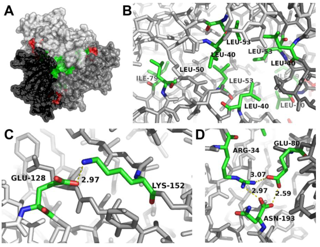 Identification of amino acids at the interaction sites between AOC2 monomers within the trimer. (A) Surface representation of the AOC2 trimer (PDB Code 2Q4I). The view is along the trimer axis. The three monomers are given in different gray scales. The hydrophobic core (detailed in (B)) and the salt bridges (detailed in (C)) are shown in green and red, respectively. Salt bridges on the back are detailed in (D); see Figure S1. (B) Location of Leu40, Leu50, Leu53 and Ile79 of all three monomers building the hydrophobic core of the trimer. (C) Salt bridge (yellow dashed line) between Lys152 of one monomer and Glu128 of the neighboring monomer. The distance between atoms building the salt bridge is given in Å. (D) Hydrogen bonds between Arg34 and Asn193 of one monomer and salt bridges (yellow dashed lines) to Glu80 of the neighboring monomer. The distances between atoms building a salt bridge are given in Å. Interacting faces are shown in stick representation (oxygen, red; nitrogen, blue; carbon, green; atoms not involved in the interaction, gray).