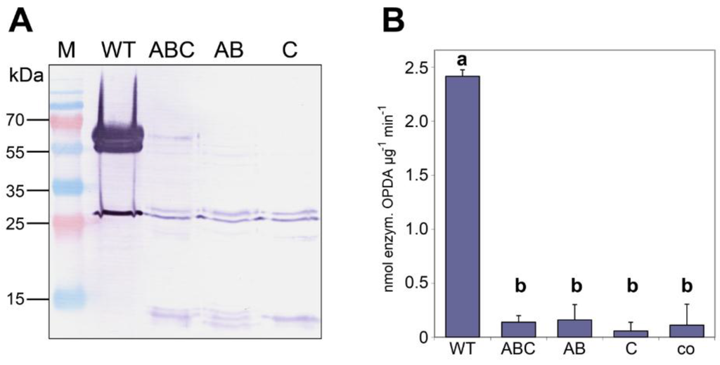 To test whether monomeric AOC2 exhibits enzymatic activity, the identified interaction sites were mutated to prevent the formation of a trimeric quaternary structure (Table 1). All three mutants and the AOC2 wild-type form were expressed as His-tagged versions in E. coli and purified (Figure 3A), whereby the yield of purified proteins was very low in the case of all mutant versions. The question could not be clarified, however, why there was a diminished production of recombinant proteins. Nevertheless, the purified mutant proteins did not appear different from wild-type AOC2 in regard to stability. Therefore, the quaternary state was compared upon SDS treatment of AOC2 proteins at 42 °C for 5 min (Figure 3A). Whereas the wild-type protein is clearly visible as a trimer with an apparent mass of about 65 kDa, the mutated AOC2 variants are monomeric. All purified proteins were used in equal amounts (10 μg purified protein each) to determine enzymatic activity by using the coupled enzymatic test by incubation with recombinant HvAOS [15] and 13(S)-hydroperoxyoctadeca-9,11,15-trienoic acid (HPOT) as the substrate. The production of cis-OPDA was recorded as enzymatically-formed OPDA and was measured in high amounts for wild-type AOC2 (Figure 3B). In contrast, proteins mutated in amino acid residues involved in the formation of salt bridges, in the hydrophobic core, or in both, reduced the AOC2 activity dramatically. Here, the detectable amount of cis-OPDA did not exceed that of the control performed by omitting any AOC protein. All of these data are in line with an essential role of trimer formation for AOC2 activity.