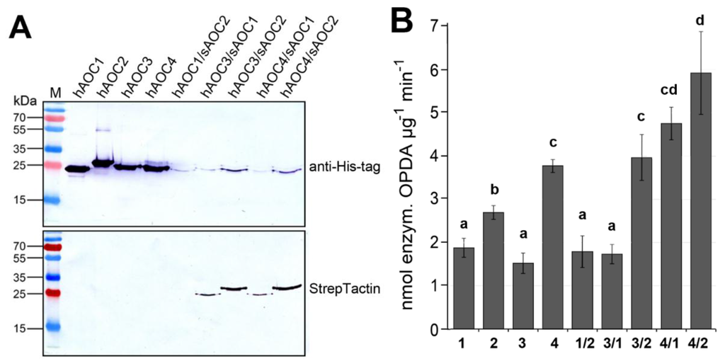 Heteromer formation could be clearly documented in immunoblot analysis via detection of His-tag and Strep-tag, respectively (Figure 4A). The significant differences among the AOC activities of heteromeric combination strongly suggest the influence of heteromerization on AOC activity (Figure 4B). The highest activity was detected for heteromers of recombinant AOC4 together with AOC1 or with AOC2. This finding is further underscored by in vivo interaction studies of Arabidopsis AOCs, where preferentially, these pairs showed the strongest signals in the BiFC analyses [9]. Moreover, promoters of AtAOC4 and AtAOC2 are both active in the vasculature of mature leaves [9], the tissue that is most important for the production of jasmonates upon wounding [20]. Furthermore, promoters of AtAOC4 and AtAOC1 are commonly active in filaments of stamen [9]. In filaments, biosynthesis of JA is of special importance, since JA-deficient and -insensitive mutants are male sterile, showing a defect in filament elongation [21].