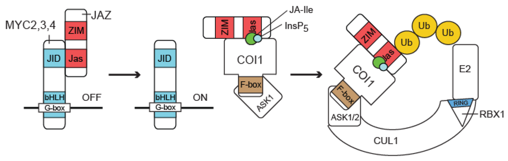 Jasmonate ZIM-domain (JAZ) proteins have been shown to constitute the missing link between the transcriptional regulation of JA responses and the perception of JA. In the absence of JAs, members of the JAZ protein family repress expression of JA-responsive genes by inhibiting MYC2 activity. Upon treatment with the hormone, JAZ proteins are degraded by the 26S proteasome, thereby allowing transcriptional activation of JA-responsive genes. This degradation is dependent on direct interaction between JAZ and COI1 [55,56,70].
