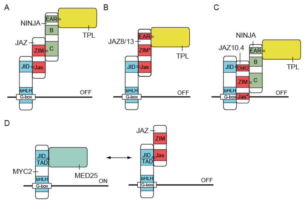 Figure 3. JAZ proteins repress JA signaling. (A) JAZ proteins interact with bHLH-type TFs, such as MYC2/3/4, mediated by direct binding between the Jas and JAZ-interacting domain (JID) domains, respectively. The ZIM domain of most JAZ proteins can interact with the adapter protein Novel Interactor of JAZ (NINJA). Through an ERF-associated amphiphilic repression (EAR) motif, NINJA is capable of recruiting the co-repressor TOPLESS (TPL) to the complex. (B) The ZIM domains of some JAZ proteins, such as JAZ8 and JAZ13, are unable to bind NINJA, but these JAZ proteins contain an EAR motif themselves. (C) Alternative splicing of certain JAZ transcripts leads to truncated JAZ proteins lacking part of the Jas domain. In the case of JAZ10.4, an N-terminal cryptic MYC2-binding domain (CMID) mediates interaction with bHLH-type TFs such as MYC2/3/4. Both JAZ8/13 and JAZ10.4 have deviating Jas domains and do not associate with SCFCOI1 in a JA-Ile dependent way. (D) The interaction of JAZ proteins with MYC2 is mediated by both the JID and the transcriptional activation domain (TAD). This interaction competes with the binding of this surface with the co-activating mediator subunit MED25. Figure partially adapted from Pauwels and Goossens [60].