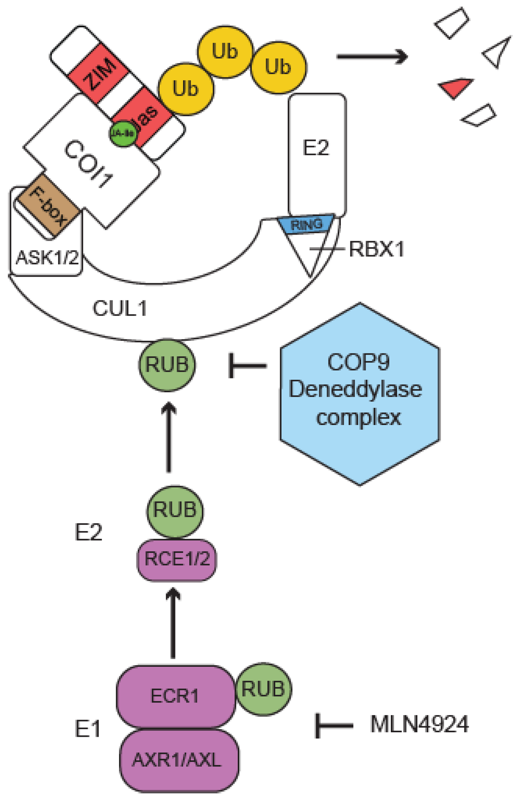 The COI1 protein was characterized as an F-box protein that, besides its N-terminal F-box domain, also contains 16 leucine rich repeats (LRRs) [64]. The F-box domain of COI1 is characteristic for proteins that associate with SCF Ub ligase complexes and the protein is closely related to other F-box proteins with a function in hormone signaling. COI1 has been shown to associate with RBX1, CUL1, and either ASK1 or ASK2 to assemble functional SCFCOI1 complexes in Arabidopsis [65,66,67]. Accordingly, plants deficient in components or regulators of SCF complexes also show impaired JA responses [54,59,68,69].