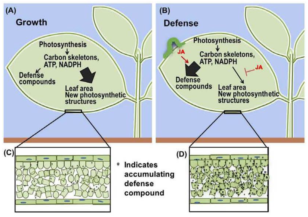 Jasmonate (JA) induces the re-budgeting of resources from tissue expansion to the production of defense compounds. (A) Plant growth is achieved using carbon skeletons, ATP, and NADPH from photosynthesis; (B) During the JA-mediated defense response, carbon skeletons, ATP, and NADPH that could otherwise contribute to growth are used for de novo synthesis of defense compounds; (C) In the absence of biotic attack, defense compounds are produced at a low basal level; (D) JA triggers the accumulation of defense compounds accompanied by an arrest of tissue expansion. In defended leaf tissue, cell size is similar to that in undefended leaves but the leaf mass per area (LMA) may increase as a consequence of increase carbon deposition into defense compounds.