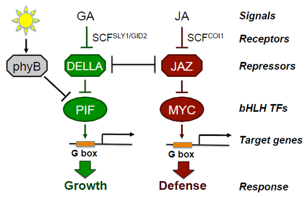 The dual roles of JA in growth inhibition and defense have mostly been studied as independent phenomena but, in light of the tradeoffs mentioned above, there is a need to understand how these two processes are integrated. Recent work is beginning to uncover mechanisms that tip the growth-defense balance through crosstalk between JA signaling and other hormone response pathways [14,30,31]. A particularly important node of crosstalk is signal antagonism between JA and the growth-promoting gibberellin (GA) pathway (Figure 2). The core JA signaling module includes the JAZ transcriptional repressors that inhibit JA responses by blocking the activity of transcription factors, such as MYC2. The bioactive form of JA, jasmonoyl-l-isoleucine (JA-Ile), promotes the interaction between JAZ proteins and the CORONATINE INSENSITIVE 1 (COI1)-containing Skp1/Cullin/F-box (SCFCOI1) E3 ubiquitin ligase complex, leading to the ubiquitination and 26S proteasome-dependent degradation of JAZs [32,33,34]. Mutants lacking a functional COI1 are compromised in all known JA-regulated processes and do not respond to the effects of the exogenous hormone [35,36,37]. The JAZ proteins modulate growth responses, at least in part, through direct interaction with the DELLA repressors of the GA pathway (Figure 2). Current evidence indicates that JAZ-DELLA interactions competitively inhibit the ability of each repressor to exert repression on cognate transcription factors [38,39,40,41]. For example, GA-triggered degradation of DELLA proteins by the GID1-GA-SCFSLY1 complex frees JAZ and results in greater inhibition of MYC transcription factors and, consequently, repression of defense responses. JAZ-DELLA interactions also favor growth by interfering with the ability of DELLAs to repress PHYTOCHROME-INTERACTING FACTOR (PIF) transcription factors that promote growth responses (Figure 2) [42]. As discussed below, this conserved mechanism of growth-defense balance is modulated by the photoreceptor phytochrome B (phyB) in response to changes in light quality. These collective findings highlight the importance of JAZ-DELLA coupling in transcriptional networks that tune the delicate balance between growth and defense.
