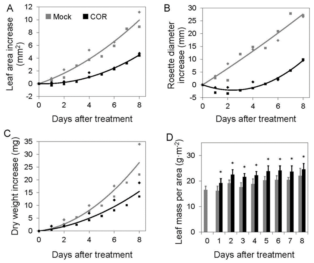 Jasmonate-mediated suppression of leaf area and biomass growth in Arabidopsis thaliana plants. Soil-grown Columbia-0 plants treated with mock (grey) or with 5 µM coronatine (COR, black) solutions [71] were measured for leaf area (A), rosette diameter (B), and dry weight (C) at indicated times after treatment. Data are the mean increase in growth (n = 12 plants) relative to the day of treatment (day 0) from two independent experiments (diamonds and squares distinguish experiments) and lines are second-order polynomial regressions of combined data from both experiments. Projected leaf area and rosette diameter were determined from overhead images, and dry weight was determined from rosettes (without roots) freeze-dried in a lyophilizer. In (D), leaf mass per area (LMA) was calculated from dry weight/leaf area from one experiment in A and C (square points). Error bars are standard deviation and asterisks indicate P < 0.05 between mock and COR treatment from a Student’s t-Test.