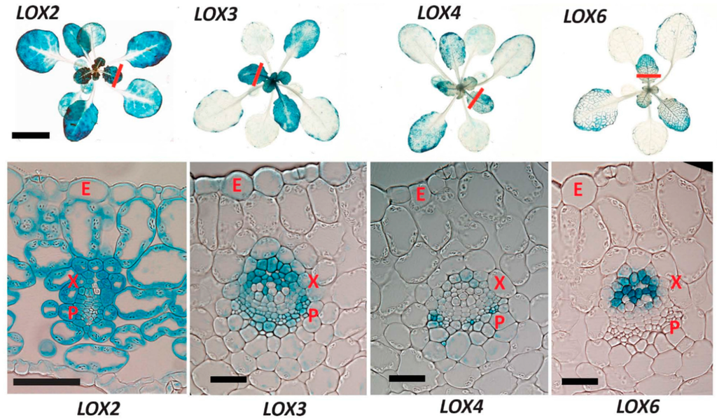 13-lipoxygenases (13-LOX) promoter-driven β-glucuronidase (GUS) activity in 3.5 week-old plants. Upper images: rosettes. Scale bar = 1 cm. Red bars indicate approximate section locations shown in lower images. E = epidermal cell; X = xylem region; P = phloem region. Scale bars for sections = 30 µm. Note that the LOX2 section was cut nearer the leaf tip than the other LOX sections.