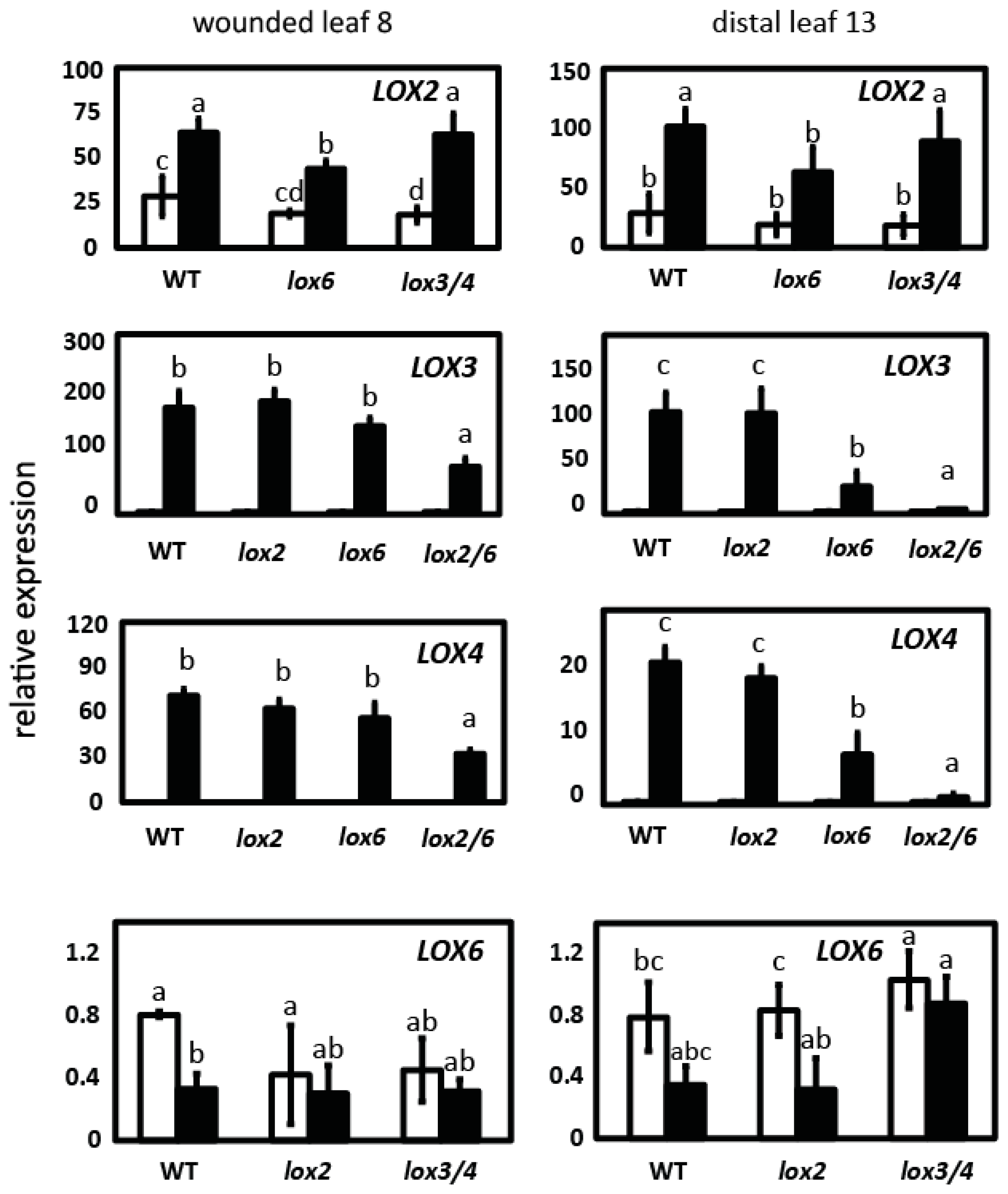 Wound-induced VSP2 expression in 13-lox mutants. Leaves 8 (wounded) and 13 (distal) were snap-frozen at 4 h after wounding (filled bars) or harvested at the same timepoint from unwounded plants (unfilled bars). Data from three (unwounded controls) to four (wounded samples) biological replicates (±SD). Letters (a, b, and c) refer to significant differences (ANOVA and t-test; p < 0.05). VSP2 transcript levels in unwounded plants is low and statistics are shown for wounded treatments only. WT = wild type; lox2 = lox2-1; lox3/4 = the lox3B lox4A double mutant; lox6 = lox6A; lox2/6 = the lox2-1 lox6A double mutant; lox2/3/4 = lox2-1 lox3B lox4A triple mutant; lox3/4/6 = lox3B lox4A lox6A triple mutant; lox quad. = lox2-1 lox3B lox4A lox6A quadruple mutant.