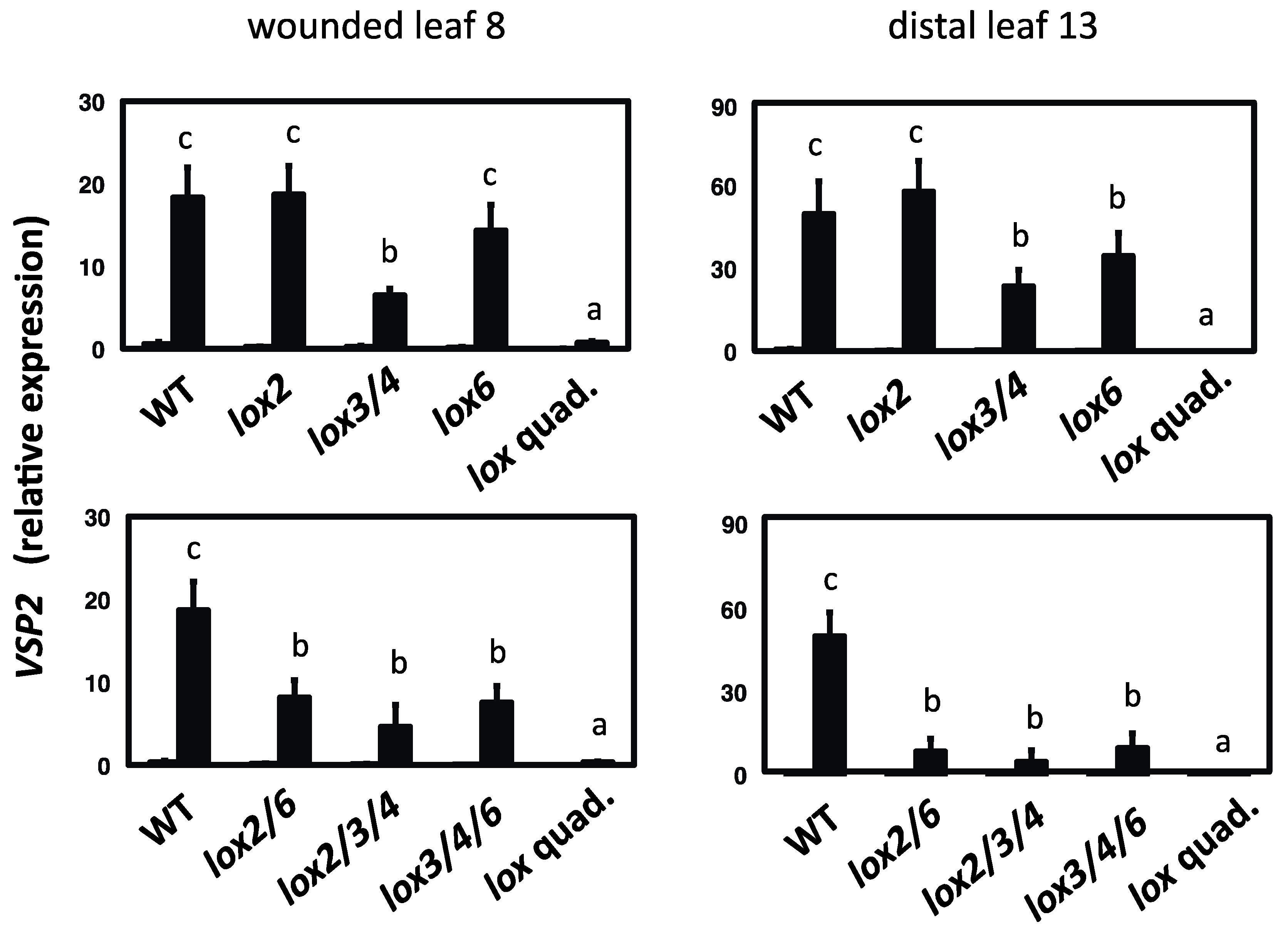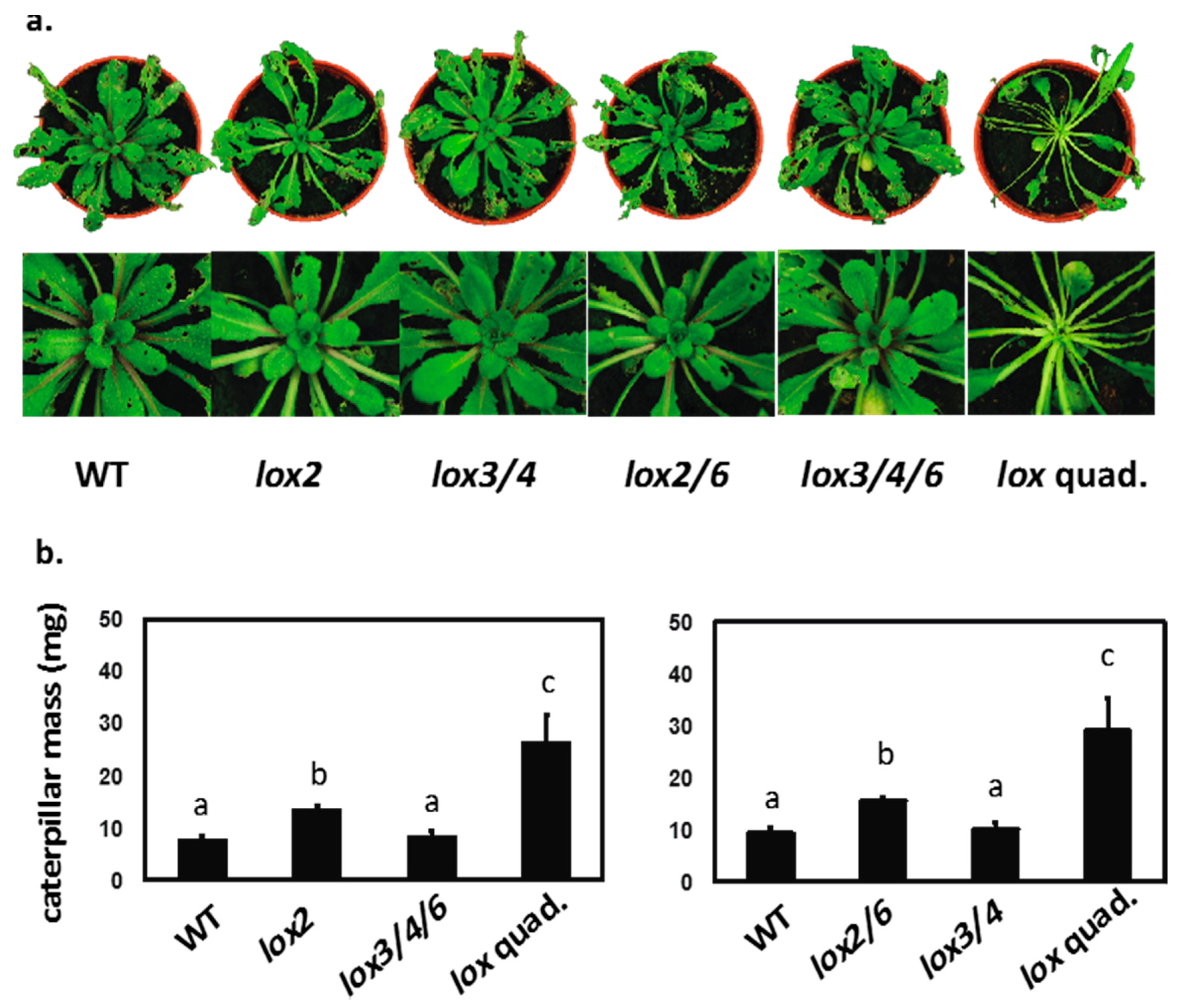 In summary, while LOX2 and LOX6 are known to make different contributions to leaf defense [9,15], the new results show that LOX3 and LOX4 also help protect the rosette.