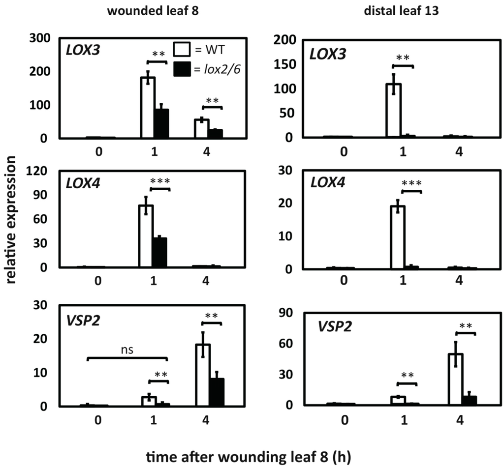 Wound-inducible LOX3, LOX4, and VSP2 expression in WT (open bars) and the lox2-1 lox6A double mutant (black bars). Leaves 8 (wounded) and 13 (distal) were snap-frozen before and after wounding. Data are from three to four biological replicates (±SD). Data from a 2h timepoint also included in the original experiment are not shown. Asterisks refer to data significantly different from WT (ns: not significant; *, p < 0.05; **, p < 0.01, and ***, p < 0.001; t-test).