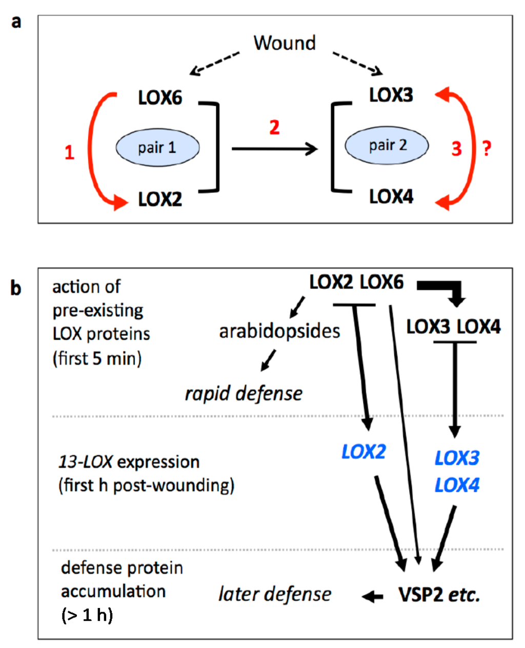 Figure 6. 13-LOX activities in wounded Arabidopsis leaves. (a) 13-LOXs interact through jasmonate production. 1. LOX6 participates in the production of jasmonate that upregulates LOX2 expression (from Figure 2). 2. LOX6 and LOX2 together produce jasmonates that enhance LOX3 and LOX4 expression (from Figure 2). 3. Still hypothetical, LOX3 and LOX4 may enhance each other’s expression through jasmonate production; (b) 13-LOX roles in the wound response. Preformed LOX2 rapidly produces arabidopsides, secondary compounds implicated in direct defense [17]. LOX6 and LOX2 produce jasmonates necessary for early gene expression (e.g., JAZ10; 9,15 and LOX3/4 expression; Figure 2 and Figure 4). LOX3 and LOX4 produce jasmonates that ensure correct late-phase VSP2 gene expression (from Figure 3 and Figure 4). Proteins, black; transcripts, blue.