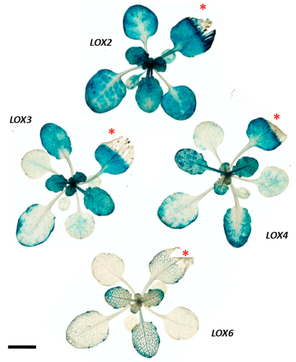 Expression of LOX promoter::GUS reporters in wounded rosettes. Plants were wounded on a single leaf (orange asterisk) and harvested 6 h later prior to staining for GUS activity. Scale bar = 1 cm.