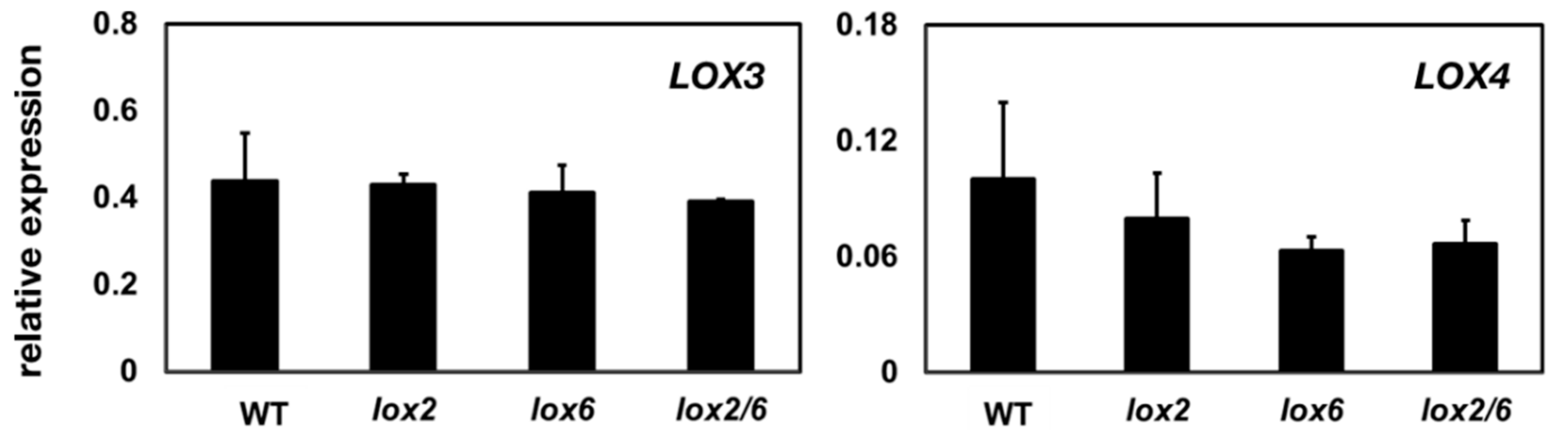 Basal LOX3 and LOX4 expression is not affected in the lox2 and lox6 backgrounds. Samples were from leaf 8 of five-week-old plants. LOX3 and LOX4 transcript levels are relative to those of UBC21.