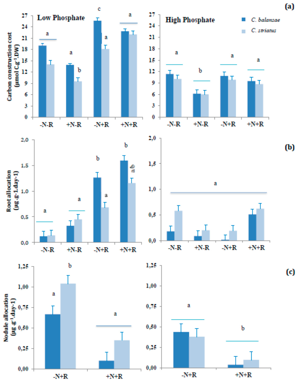 (a) Plant construction costs; (b) Root allocation and (c) Nodule allocation of 22-week-old Cytisus balansae (cba) and Cytisus striatus (cst) seedlings, grown in sand culture treated with −N−R, +N−R, +N−R and +N+R, under two levels of phosphate (Low and High). Values are means (n = 10, except for −N−R where n = 6) ± standard deviation. Different letters indicate significant differences among treatments (* p ≤ 0.05).