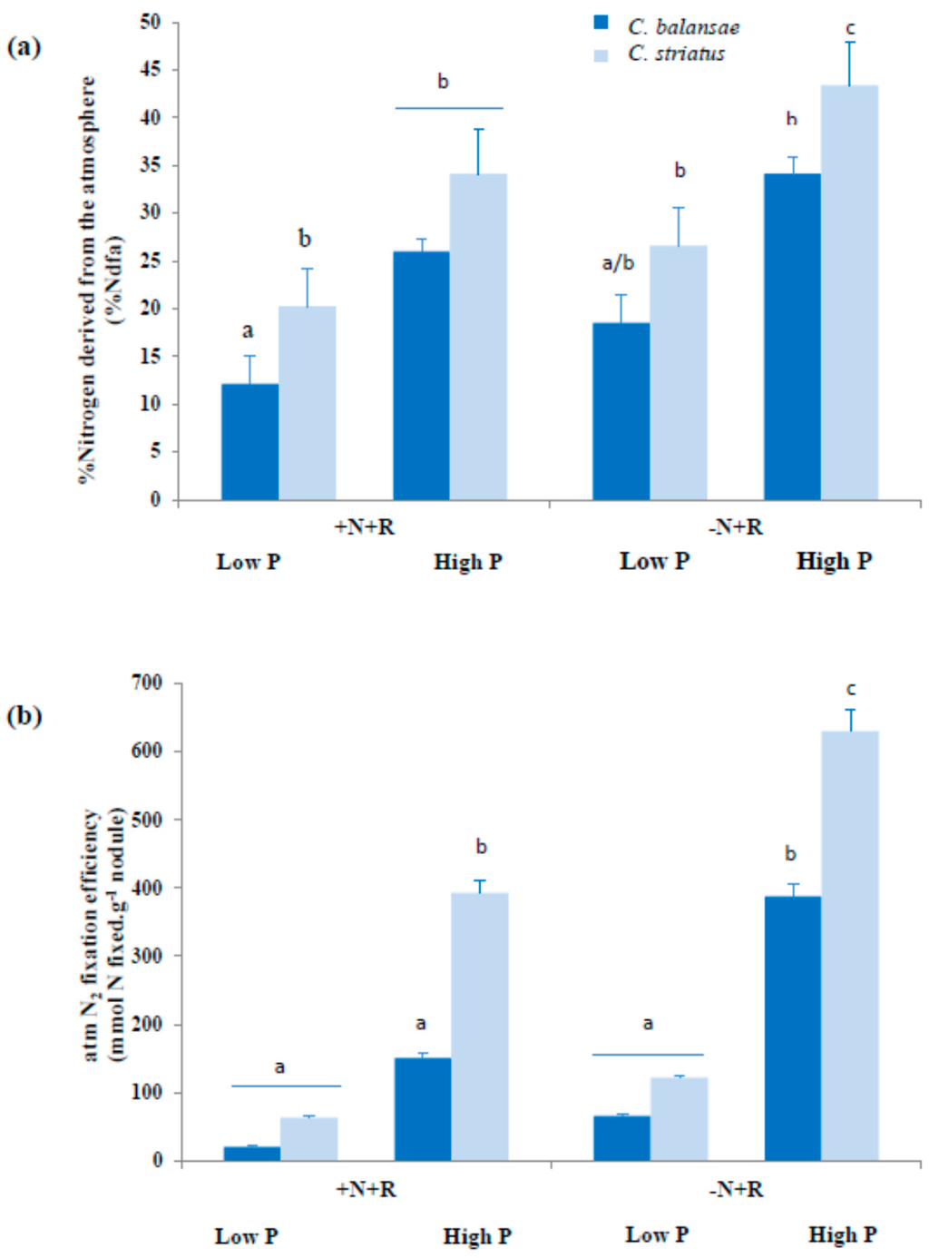 Total N2 fixation varied between species and amongst treatments. N2 was significantly lower in cba than in cst; overall for the two species, N2 fixation efficiency was greater in the high P treatment than in the low P treatment (Figure 2a). The amount of N2 fixed biologically was significantly lower in plants supplied with NH4NO3, as indicated by the decline in %Ndfa in plants in the +N+R treatment compared with plants grown in the inoculated treatment (−N+R) (Figure 2a). With the exception of the −N−R treatment, for which N concentration was significantly low (1.07 ± 0.06; p = 0.038), there were no differences for this variable in the +N−R (1.91 ± 0.23; p < 0.05), −N+R (2.08 ± 0.09; p < 0.043) and +N+R (2.46 ± 0.11; p < 0.021) treatments. N2 fixation efficiency was greater in cst than in cba. Plants solely reliant on N2 fixation were more efficient at fixing N at the two levels of P according to the amounts of N fixed per nodule (Figure 2b).