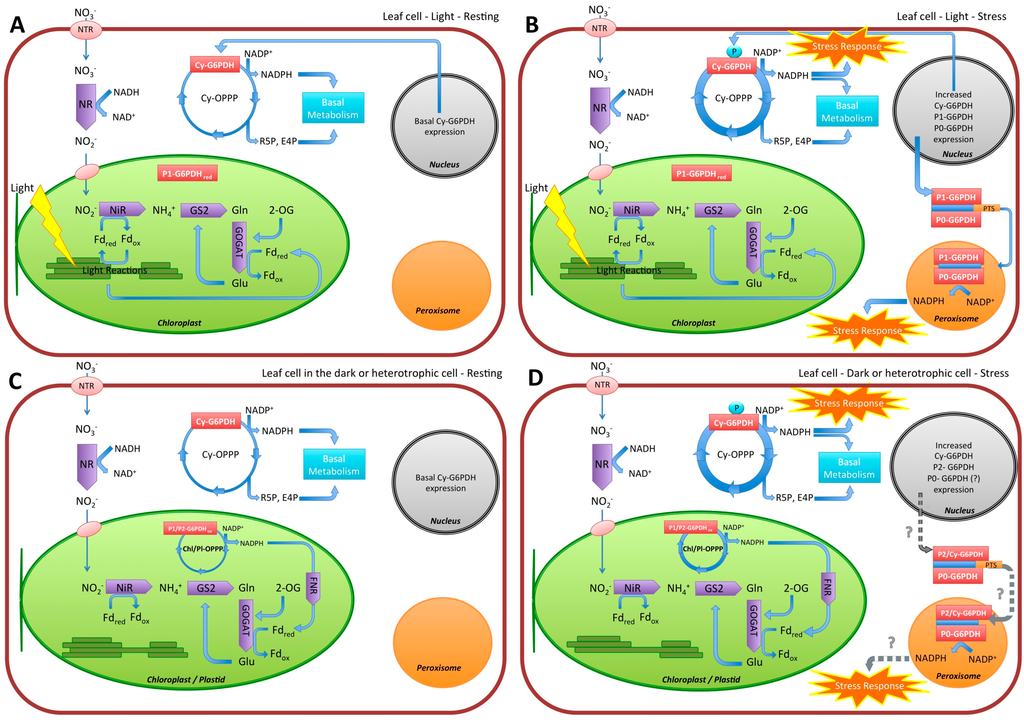 The compartmented chloroplastic (P1-G6PDH) and plastidial (P2-G6PDH) isoforms are connected with the furnishing of reductants for nitrogen assimilation, but upon stress conditions, both activities can be recruited for resistance and/or tolerance strategies.