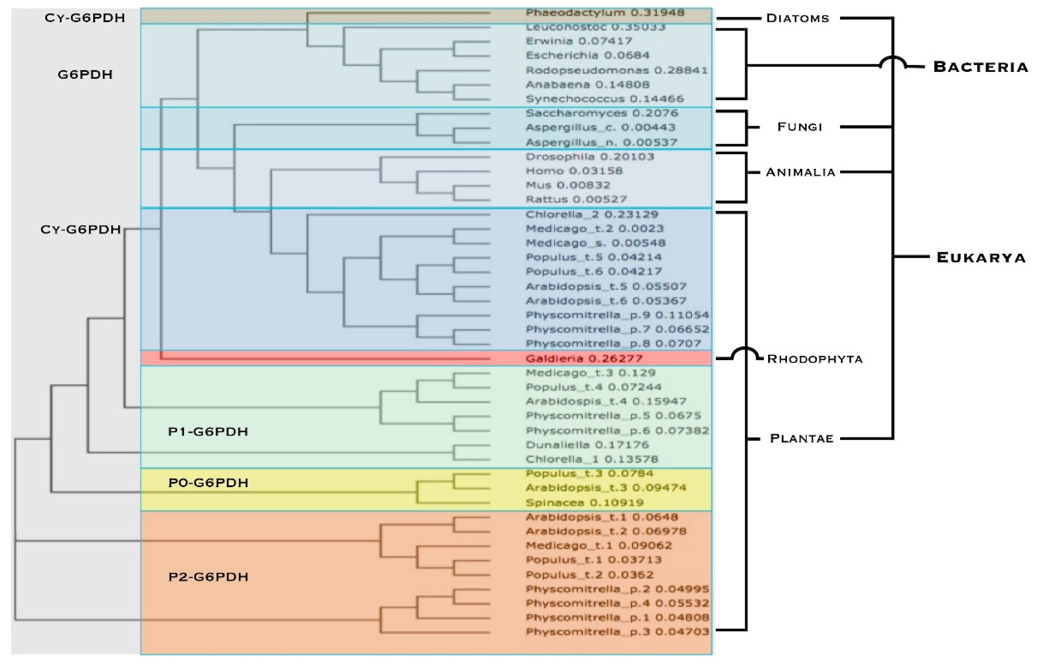 Figure 2. Phylogenetic tree of G6PDH isoforms from various living organisms. Blue and violet highlights designate cytosolic isoforms (simply indicated as G6PDH in Bacteria). Green highlight indicates the chloroplastic P1 isoforms. Yellow indicates the catalytically inactive P0-isoforms. Orange for the plastidial P2-G6PDH isoforms. Red highlight is for Red Algae isoform. Other details in the text.