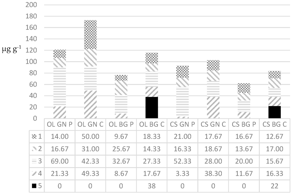 Average masses (µg) of the five phenylphenalenones (1–5) detected per g pseudostem (P) or corm material (C) from Musa AAA cv. “Grande Naine” (GN) or Musa ABB cv. “Bluggoe” (BG) after being fed on by either Cosmopolites sordidus (CS) or Odoiporus longicollis (OL) for 6 weeks. The values are the averages of two very similar measured masses.
