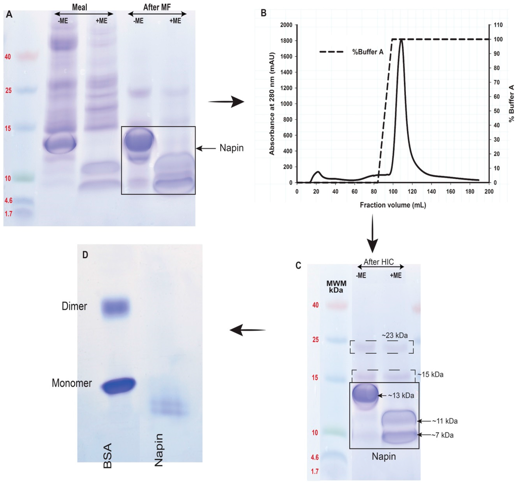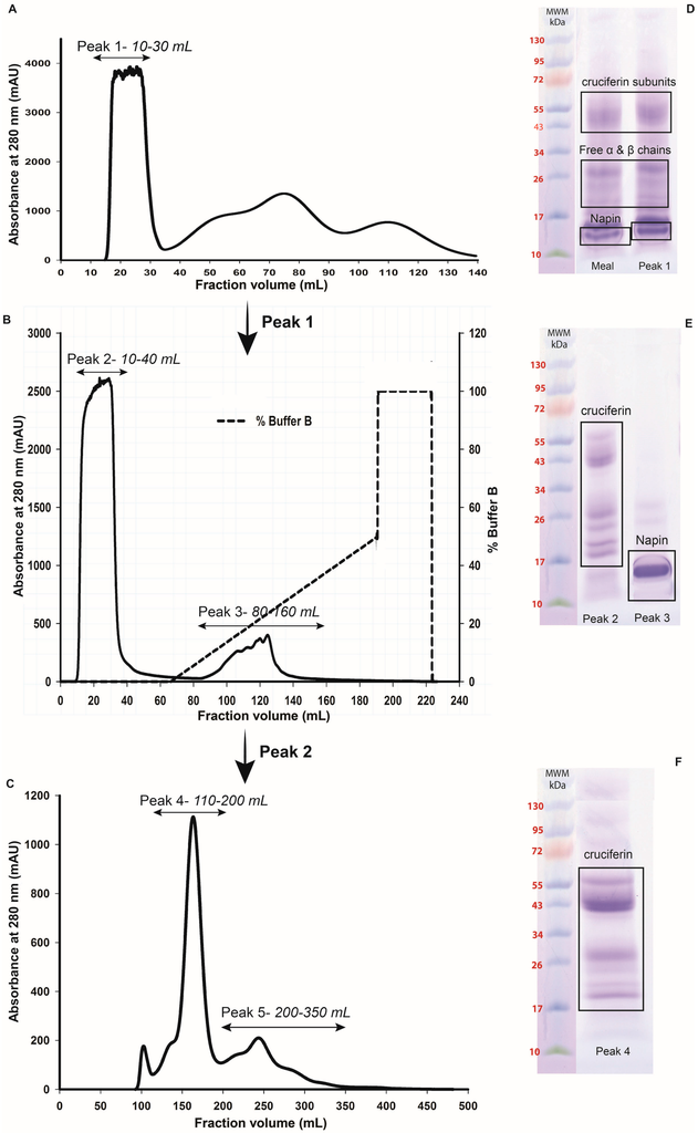 - Bérot, S.; Compoint, J.P.; Larré, C.; Malabat, C.; Guéguen, J. Large scale purification of rapeseed proteins (Brassica napus L.). J. Chromatogr. 2005, 818, 35–42. [Google Scholar] [CrossRef] [PubMed]