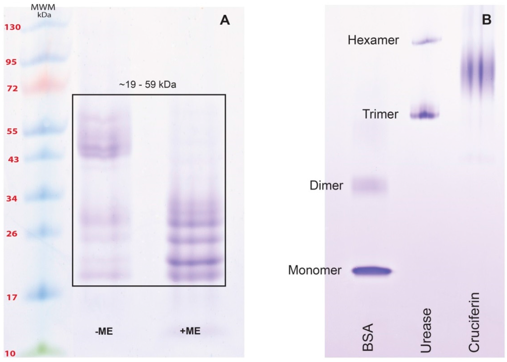 4.7. Native Polyacrylamide Gel Electrophoresis (Native-PAGE)