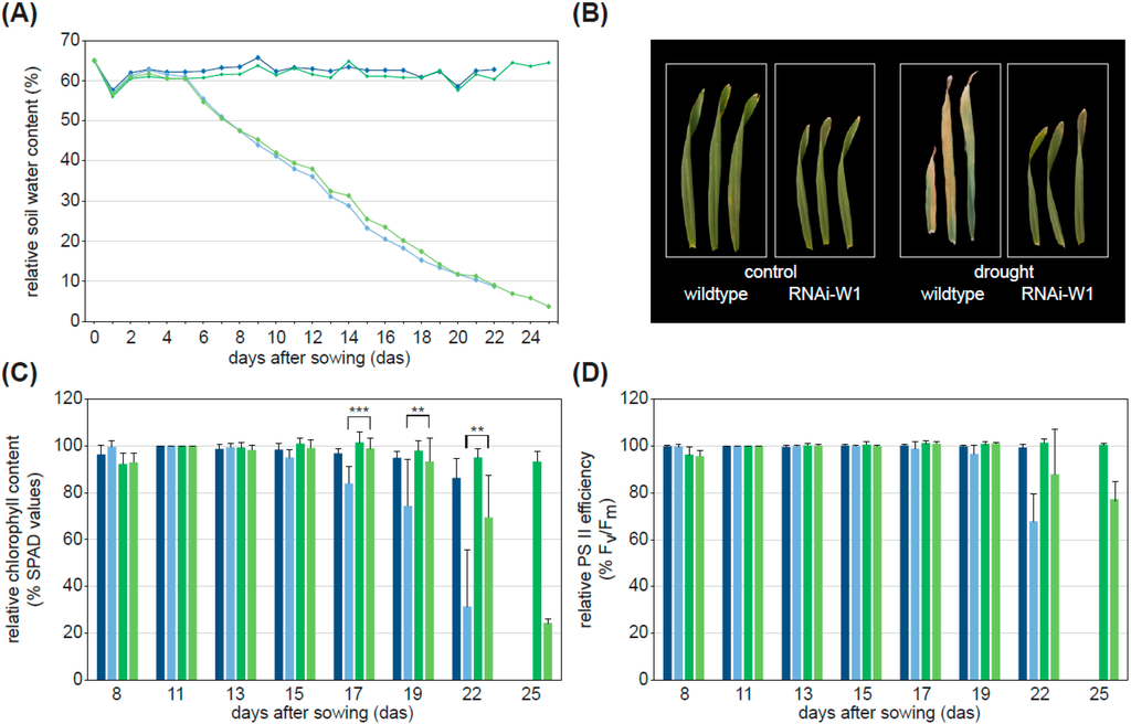 Drought stress-induced differences in the phenotypic appearance and physiological parameters of WT control (blue), WT drought (light blue), RNAi-W1 control (green), RNAi-W1 drought (light green) plants. (A) Relative soil water content in control pots and pots drying out with WT and RNAi-W1. To induce drought stress, irrigation was terminated at four das; (B) Representative pictures of WT and RNAi-W1 leaves under control and drought-stress conditions at 22 das; (C) Chlorophyll content (% SPAD values) and (D) PS II efficiency (% Fv/Fm) during drought stress in WT and RNAi-W1 leaves compared to controls. Data of 11 das were set as 100%. Asterisks indicate statistically significant differences (paired Student′s t-test p values, ** p < 0.01; *** p < 0.001) between drought-stressed WT and RNAi-W1. Data represent the average (± SD) from at least three independent, individual experiments.