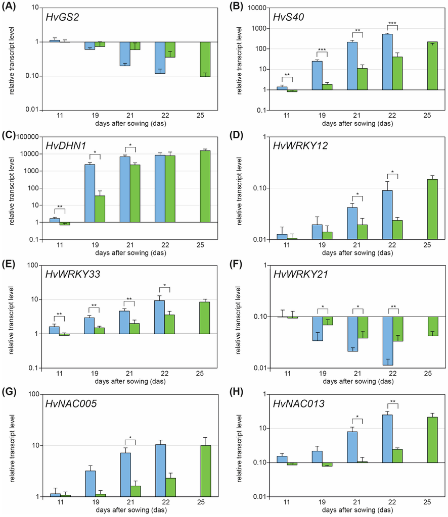 Relative transcript levels in drought-stressed WT (light blue) and RNAi-W1 (light green) plants of (A) senescence down-regulated gene HvGS2; (B) senescence-associated gene HvS40; (C) drought stress-related HvDHN1; (D,E,F) WRKY transcription factor genes HvWRKY12, HvWRKY33 and HvWRKY21 and (G,H) NAC transcription factor genes HvNAC005 and HvNAC013. At each data point, transcript levels in drought-stressed plants are compared to those in control plants. Asterisks indicate statistically significant differences (paired Student′s t-test p values, * p < 0.05; ** p < 0.01; *** p < 0.001) between drought-stressed WT and RNAi-W1. Each data point represents the average (±SD) from at least three independent, individual experiments.