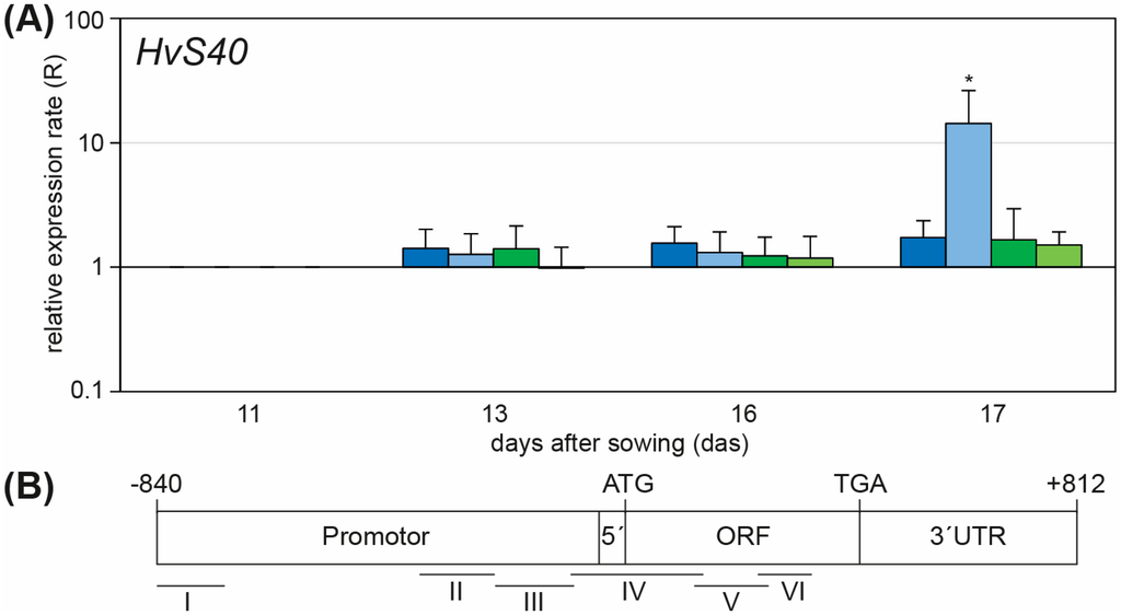 Recently, for Arabidopsis thaliana [6], but also for barley [7], another superior level of regulation of the senescence program was identified. The authors could show an adjustment of chromatin status of senescence-associated genes via epigenetic mechanisms. It has been demonstrated that especially euchromatic histone modification marks like H3K4me2/3 and H3K9ac are established in respective promoter and coding regions of senescence-associated genes (AtWRKY53 and HvS40), indicating the action of epigenetic mechanisms in regulation of leaf senescence. An increasing number of investigations showed that various types of stress responses are also under the control of epigenetic mechanisms [26,27]. In this study, a differential setting of histone modification marks in response to drought stress at promoter and coding sequences of the senescence-associated barley gene HvS40 has been demonstrated. Interestingly, in the early response to drought stress, the euchromatic mark H3K9ac was observed to be established at promoter and coding regions of HvS40. Establishment of H3K9ac is known to open chromatin structure by changing the charge distribution and thereby allowing access of regulatory proteins to DNA, resulting in induction of transcription [28,29,30,31]. Similar observations have been reported for stress-related genes in Arabidopsis thaliana and in rice, where euchromatic marks such as the methylation pattern at H3K4 are set when plants are exposed to drought [32,33,34].