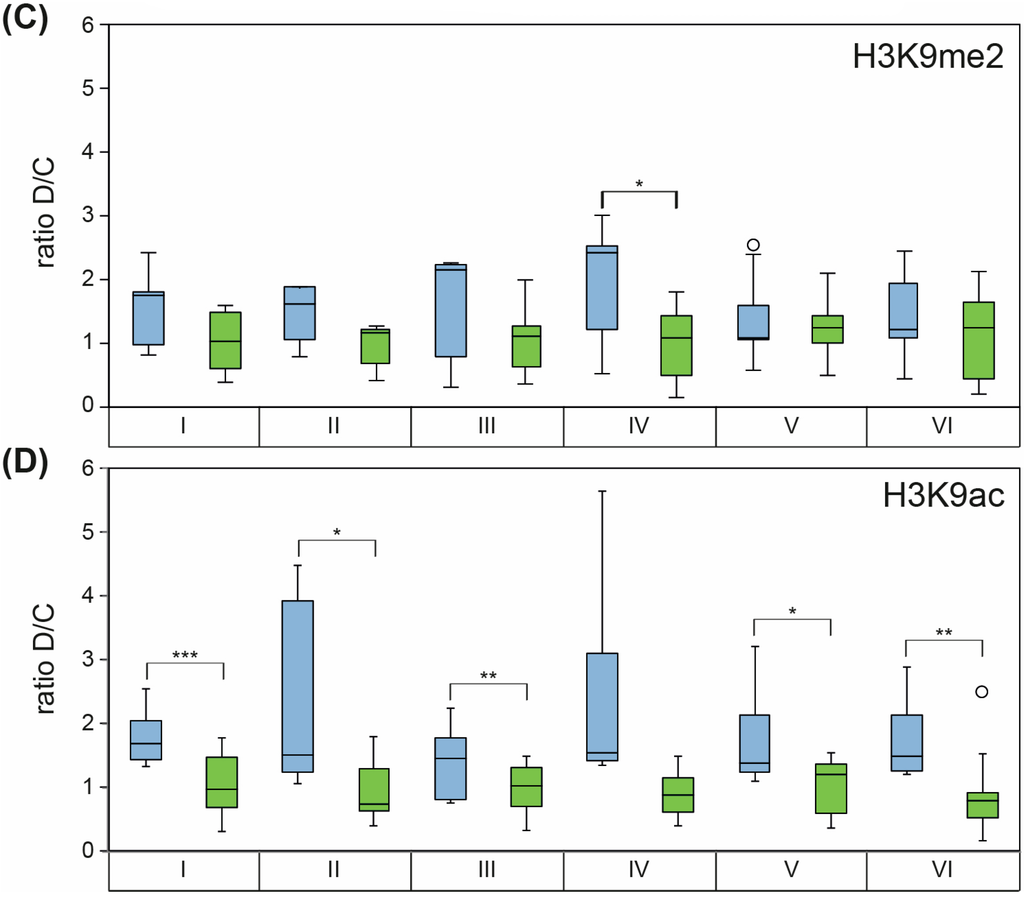 Recent investigations showed senescence-specific alterations in histone modifications of senescence-associated genes (SAGs) [6,7]. Senescence and stress are closely linked; thus, drought stress can also induce the expression of several SAGs as displayed for HvS40 (Figure 2B). This result is in accordance with the high expression of HvS40 in response to abscisic acid [8]. Analysis under a shorter timescale (Figure 3A) showed that up-regulation of HvS40 under these conditions started in parallel with the loss of chlorophyll (Figure 1C), at day 17 after sowing in WT plants. To investigate whether the induction of HvS40 during drought stress is also accompanied by differential histone modifications at its promoter and coding sequence, chromatin immunoprecipitation (ChIP) analyses with antibodies directed against the euchromatic mark H3K9ac (histone 3 lysine 9 acetylation) and the heterochromatic mark H3K9me2 (histone 3 lysine 9 dimethylation), respectively, were performed. Mature leaves of control plants were compared with drought-stressed WT leaves from 17 das, where HvS40 was not induced in well-watered control plants, but significantly induced in drought-stressed plants (Figure 3A). Quantification of levels of the two markers was performed via qRT-PCR using six primer pairs, covering specific sites in the promoter and coding sequence (positions in relation to the ATG codon I: −840 to −718 bp, II: −369 to −234 bp, III: −232 to −92 bp, IV: −96 to +141 bp, V: +125 to +257 bp and VI: +239 to +334 bp) of HvS40 (Figure 3B). In Figure 3C, results are plotted for the heterochromatic mark, showing the ratio (D/C) in levels of H3K9me2 in drought-stressed (D) and control (C) leaf samples in WT and RNAi-W1. In addition, in Supplemental Figure S1, levels of labeling with H3K9me2 are separately plotted for control and drought-stressed leaves in both, WT and RNAi-W1. These data show that in WT, drought stress causes a slight increase in H3K9me2 levels of HvS40. In RNAi-W1, however, drought stress caused no significant increase in labelling with H3K9me2. In accordance with the induction of HvS40 (Figure 3A), the euchromatic mark H3K9ac is substantially increased in WT after drought treatment (see Figure 3 and Supplemental Figure S1), resulting in a significant increase in this mark at all promoter and coding sequence regions of HvS40 analyzed. However, since sonication yields DNA fragments in a range of different sizes, it is difficult to exactly resolve which regions of the gene have H3K9ac-modified histones. In contrast to the WT, in RNAi-W1, H3K9ac levels are not increased (Figure 3D, ratio = 1). This correlates with the finding that, in contrast to the WT, HvS40 is not induced above the control level in RNAi-W1 plants at 17 das (Figure 3A). Our data revealed that drought stress induces the establishment of euchromatic histone modifications of HvS40, and that the function of WHIRLY1 might be connected to the stress and development related setting of epigenetic marks.