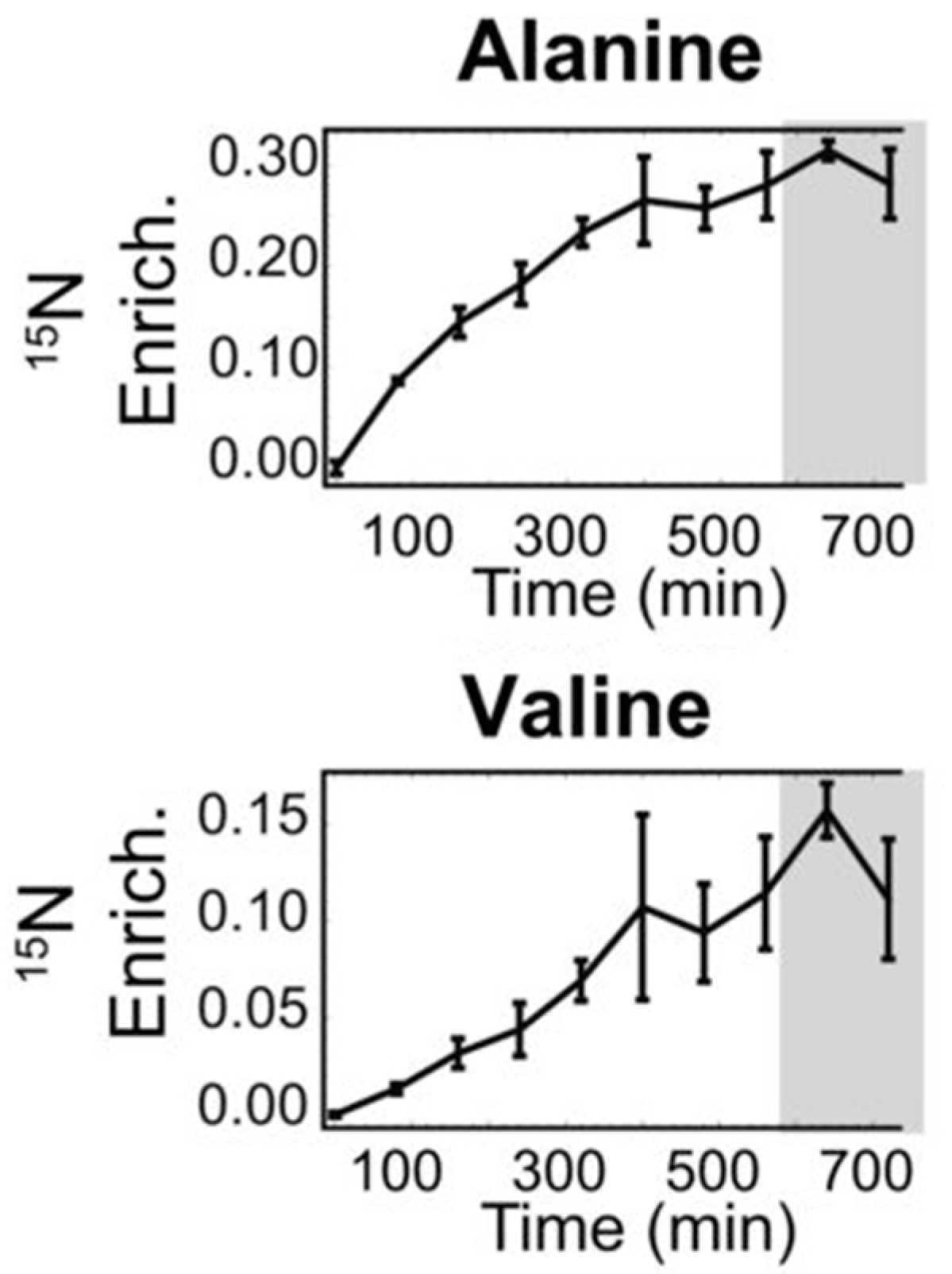 15N enrichment levels of two amino acids in barley leaves provided with 15N-labelled KNO3, as determined by gas chromatography-mass spectrometry (GC-MS). Light periods are marked in white and dark periods in gray. Adapted with permission from [78].