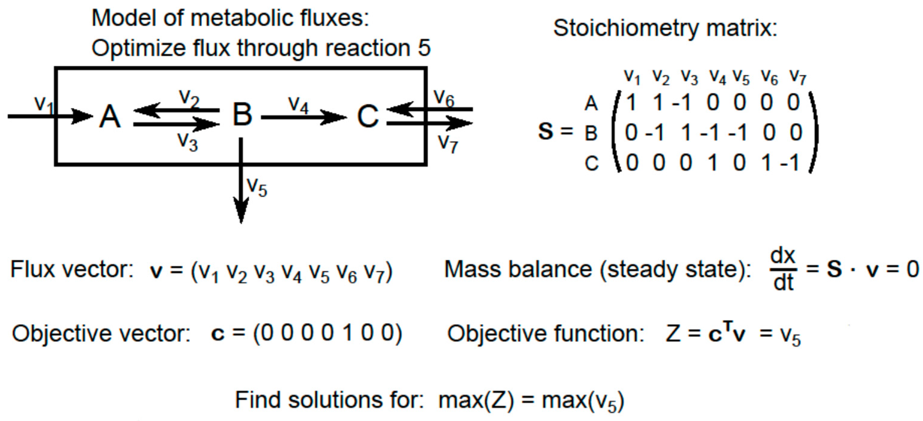 Example of a simple metabolic flux model and the equations for defining a flux balance analysis to maximize flux through reaction 5.