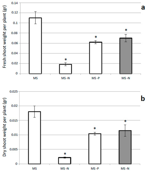 Quantitative analysis of growth parameters of L. japonicus plants grown in the presence/absence of N and P sources. (a) Fresh shoot weight per plant; (b) Dry shoot weight per plant. The different N and P regimes are indicated and grey bars represent values obtained after M. loti inoculation. Data bars represent means and SD of measures from three experiments (15 plants per experiment per condition). Data are scored 25 days after sowing (21 days after transferring the plants from H2O agar). Asterisks indicate significant differences with values scored on MS medium (p < 0.05).