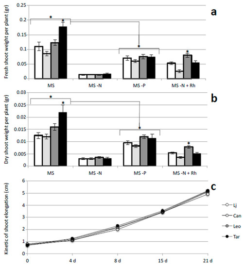 In order to minimize micro-environmental effects due to culturing conditions the different cvs are grown in the same Petri dishes and phenotypes evaluated by using L. japonicus plants for comparison of quantitative parameters. The efficacy of the experimental in vitro conditions designed for the phenotypical quantitative screening is confirmed by the observation that all the three L. corniculatus cvs tested show a significant decrease of shoot weight growth parameters in the absence of P nutrient in the growth medium (Figure 3a,b). Interestingly, Targovishte 1 cv. shows a better growth capacity in terms of both fresh and dry shoot weight in MS rich medium (about 40% increase), when compared to L. japonicus, Canetra and Leo (Figure 3a,b). The same effect is not observed in the absence of N probably because in that case, the severity of the shoot weight phenotype does not allow for quantitating possible effects related to the presence of P into the medium. This growth capacity may be related to a more effective P acquisition capacity as we do not observe significant changes of shoot weights measures between different cvs in the absence of P nutrients but even a N/P combination effect, where N is essential for a better P acquisition, must be taken in account (Figure 3a,b).