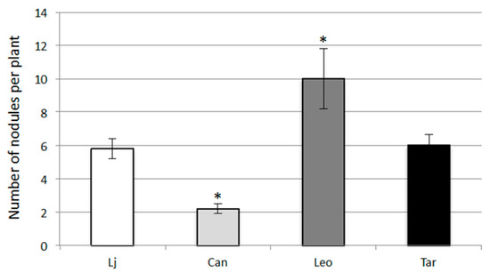 Nodulation capacities of L. japonicus (Lj) and L. corniculatus cvs. Canetra (Can), Leo and Targovishte 1 (Tar). The plants are grown after inoculation with M. loti for three weeks under N-free MS medium. Data bars represent means and SD of measures from three experiments (10 plants per experiment per condition). Data are scored 25 days after sowing (21 days after transferring the plants from H2O agar). Asterisks indicate significant differences with nodules scored on L. japonicus plants (p < 0.05).