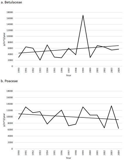 Aerobiological data have especially demonstrated the correlation between climate warming and pollination seasons [6,7,8,9,10,11]. Following this approach, we report on the trend of airborne pollen data from two of the most important botanical families at mid latitudes, Betulaceae and Poaceae. In European countries, they represent large part of the current plant cover as woody (Birch family) and herbaceous (grasses) species. Both the Birch family (Alnus, Betula, Carpinus, Corylus, Ostrya) and grasses (wild and cultivated, including cereals) are wind-pollinated and produce among the vast amounts of pollen in the spring and summer airflows in Europe [12]. Despite cleistogamous species obviously making a light contribution to airborne pollen rain, grasses are responsible for the most important allergy symptoms registered in the world (e.g., [13]).