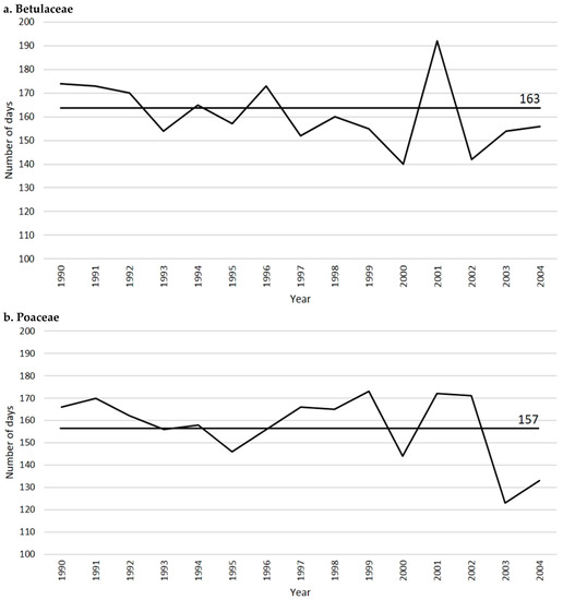 Duration of pollen season of Betulaceae (a) and Poaceae (b) from 1990 to 2004.