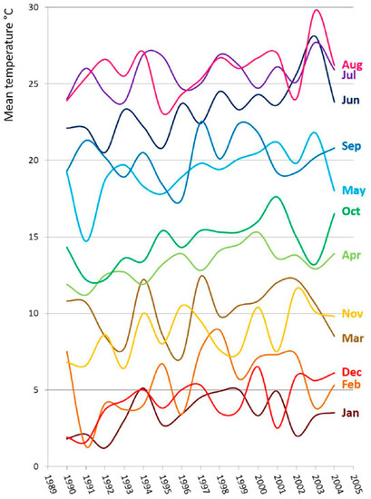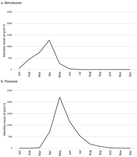 Aerobiological data can explain unpredictable annual variability of concentrations over the years but cannot be fully responsible for the increasing trend of Betulaceae (Figure 1a) versus the decreasing trend of Poaceae (Figure 1b). In general, the monthly trends and concentrations follow patterns that are typical and repeated after a seasonal basis. Thus, the Betulaceae pollen season is January–July with acme in April whilst the Poaceae pollen season is March–September with acme in May (Figure 3). Data are in agreement with the general information that is usually obtained from the European pollen monitoring network [26].