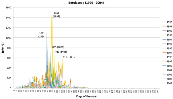 Daily peaks of pollen concentration of Betulaceae: a comparison from 1990 to 2004.