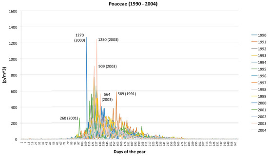 Daily peaks of pollen concentrations of Poaceae: a comparison from 1990 to 2004.