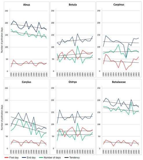 Differently from what has been observed for pollen of Taxus [9]—which represents a woody species highly sensible to temperature increase—by considering the general trend of the families, we can conclude that the duration of the pollen season of Betulaceae and Poaceae was not unequivocally altered by warming climate. Deepening the role of different trees in the Birch family, significant differences emerged by distinguishing the winter and spring blooming species: they actually are sensible to the temperatures of the season when microsporogenis starts.