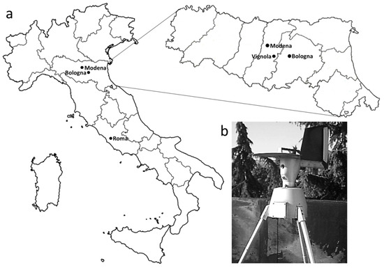 (a) Location map of Vignola, Emilia-Romagna, Northern Italy; (b) Lanzoni VPPS 2000 spore trap.