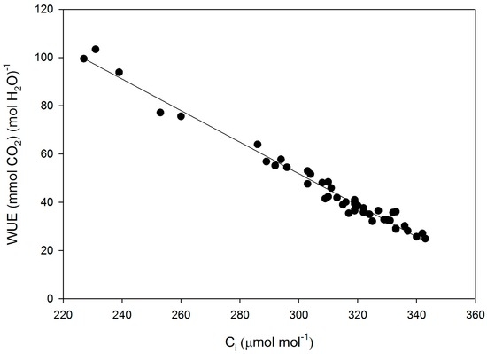 Leaf intrinsic water use efficiency (WUE) as a function of sub-stomatal CO2 concentration (Ci) for all measurements made on fifteen cultivars of soybean. The linear regression: WUE = 248 − 0.654 × Ci had an r2 of 0.98.