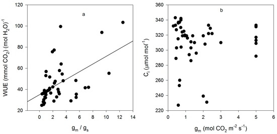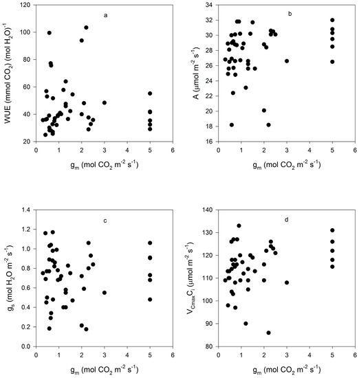 Intraspecific variation in gm has been reported in barley [6], grape [7], tomato [8], wheat [9], and rice [10], and its relationship to leaf WUE examined. In grape and barley, gm was positively correlated with leaf WUE. In tomato and rice, variation was found in the ratio of gm to gs, and that ratio was correlated with leaf WUE. In wheat variation, gm was correlated with A, but there was no clear relationship between gm and leaf WUE.