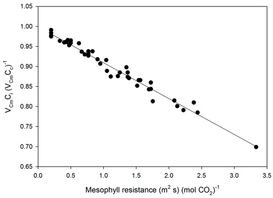 The ratio of VCmax based on Ci to that based on Cc as a function of mesophyll resistance, the reciprocal of gm, for all measurements made on fifteen cultivars of soybean. The linear regression: VCmCi/VCmCc = 1.00 − 0.090 × (1/gm) had an r2 of 0.976.