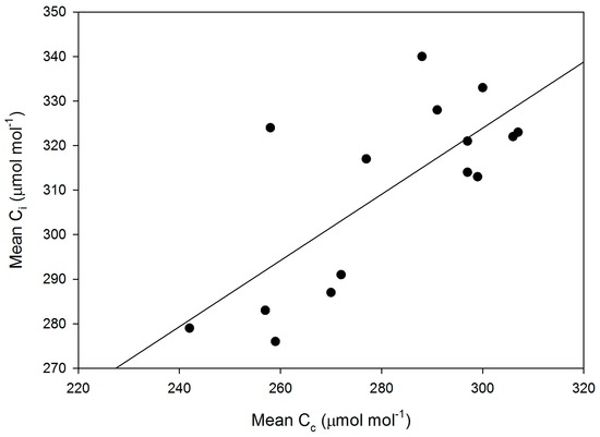 Cultivar mean values of Ci versus mean values of Cc. The linear regression had an r2 value of 0.532.