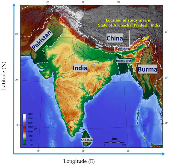 Location of the study area at the Zemithang region in the state of Arunachal Pradesh, India pointed by the yellow arrow (map not to scale).