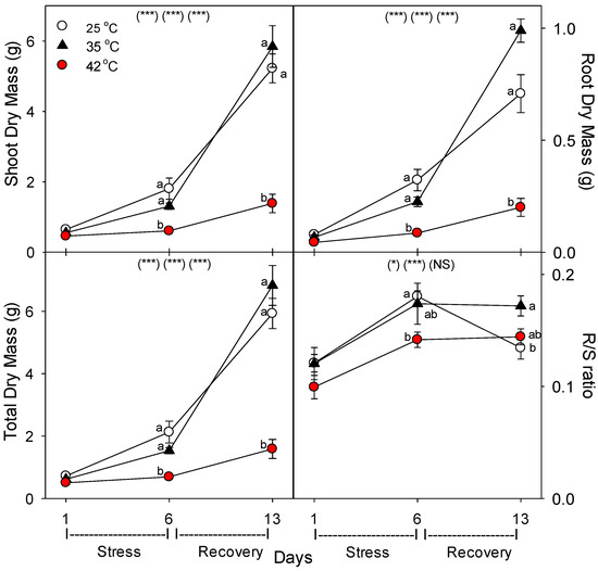 Effect of abrupt heat stress on biomass of tomato. Plants were grown at 25/20 °C day/night (control), and then subsets of plants were heat stressed at 35/30 or 42/37 °C day/night for one or six days (maximum root temperatures = 32 or 39 °C), and then returned to control conditions for seven days of recovery (=day 13). Values are means ± 1 SE for four independent replicates from each harvest (days 1, 6, 13). Within each variable, the significance of main treatment effects (temperature, day, temperature × day) is indicated in parentheses (* p < 0.05, ** p < 0.01, *** p < 0.001, NS = not significant). Different lowercase letters indicate significant difference among temperature treatments within each day.
