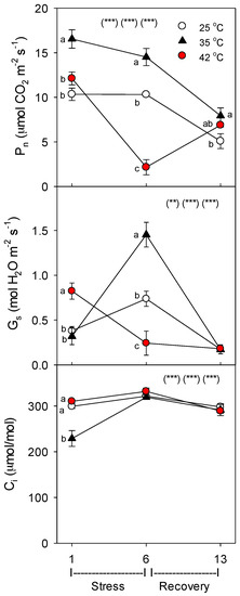 Effect of abrupt heat stress on net photosynthesis (Pn), stomatal conductance (Gs), and leaf internal CO2 concentration (Ci) of tomato. Plants were grown at 25 °C/20 °C day/night (control), and then subsets of plants were heat stressed at 35/30 or 42 °C/37 °C day/night for one or six days (maximum root temperatures = 32 °C or 39 °C), and then returned to control conditions for seven days of recovery (=day 13). Values are means ± 1 SE for four independent replicates from each harvest (days 1, 6, 13). Statistics are as in Figure 1. * p < 0.05, ** p < 0.01, *** p < 0.001.