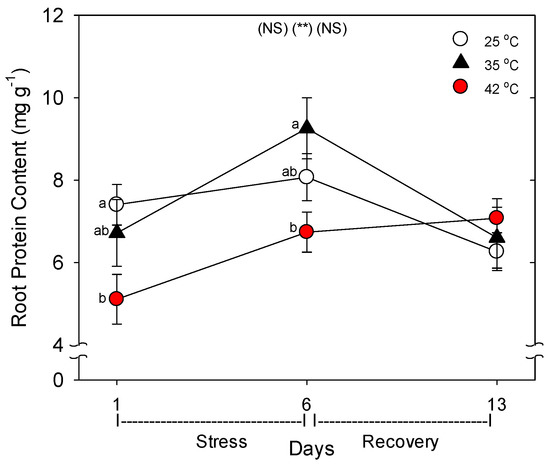 Effect of abrupt heat stress on protein content per gram (fresh weight) of roots. Plants were grown at 25 °C/20 °C day/night (control), and then subsets of plants were heat stressed at 35 °C/30 °C or 42 °C/37 °C day/night for one or six days (maximum root temperatures = 32 °C or 39 °C), and then returned to control conditions for seven days of recovery (=day 13). Values are means ± 1 SE for four independent replicates from each harvest (days 1, 6, 13). Statistics are as in Figure 1. ** p < 0.01.